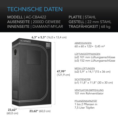 This tent has been developed for growing plants indoors and offers complete control over the climate conditions. The tent is equipped with a quick-view window and is made of waterproof Oxford fabric with a thickness of 2000D, which is particularly durable and opaque. The inner walls are covered with cross-patterned Mylar that reflects and maximizes the light output of your grow light. An inner tape seam seals the zipper inside the tent to ensure maximum reflectivity and prevent light loss. This is complemented by a protective cover that runs the entire length of the front zipper and provides further protection against light penetration. The ventilation openings can be closed on both sides to ensure a light-tight seal. Accessories include a waterproof floor tray, a removable tool bag, additional hanging rods for the roof and a mounting plate to attach your controller to the grow tent.